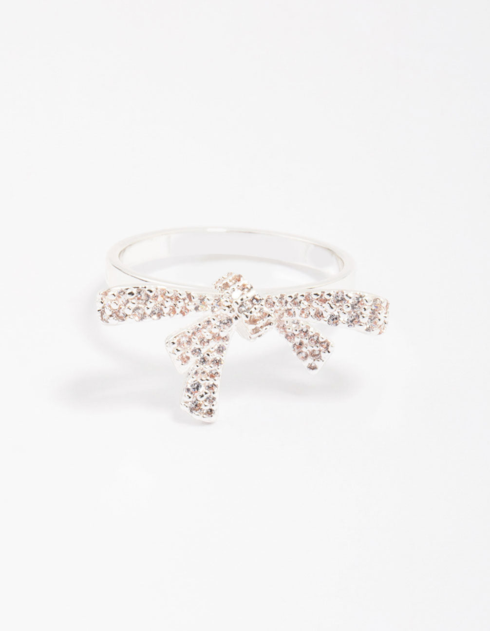 For a coquette-inspired touch to your stack, style this dainty stacking ring. This ring features a fine, silver-toned band adorned with a crystal encrusted bow for an on-trend finish.