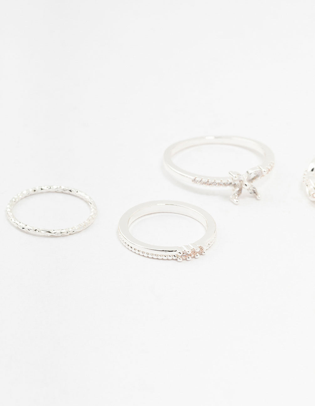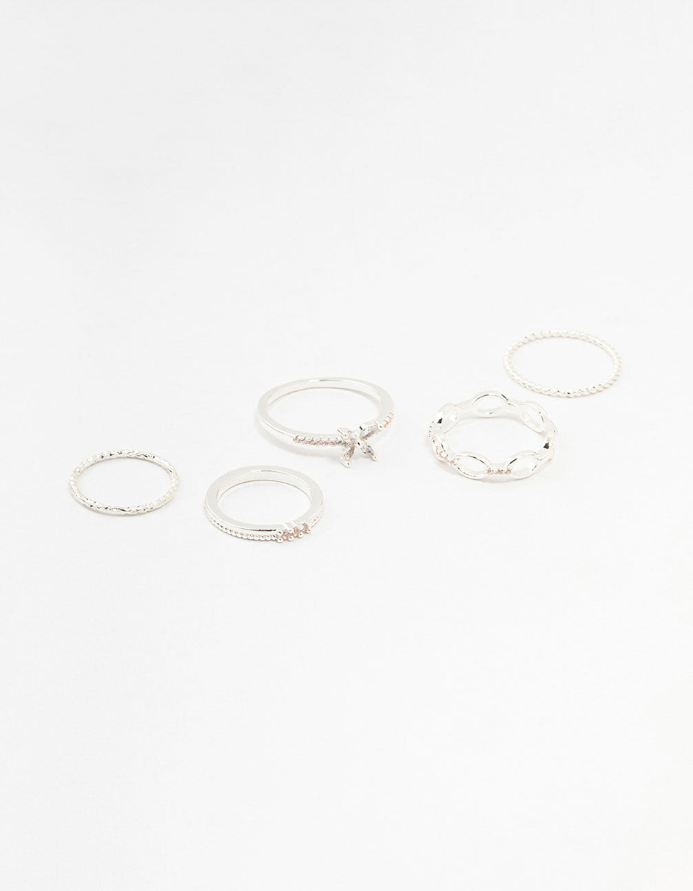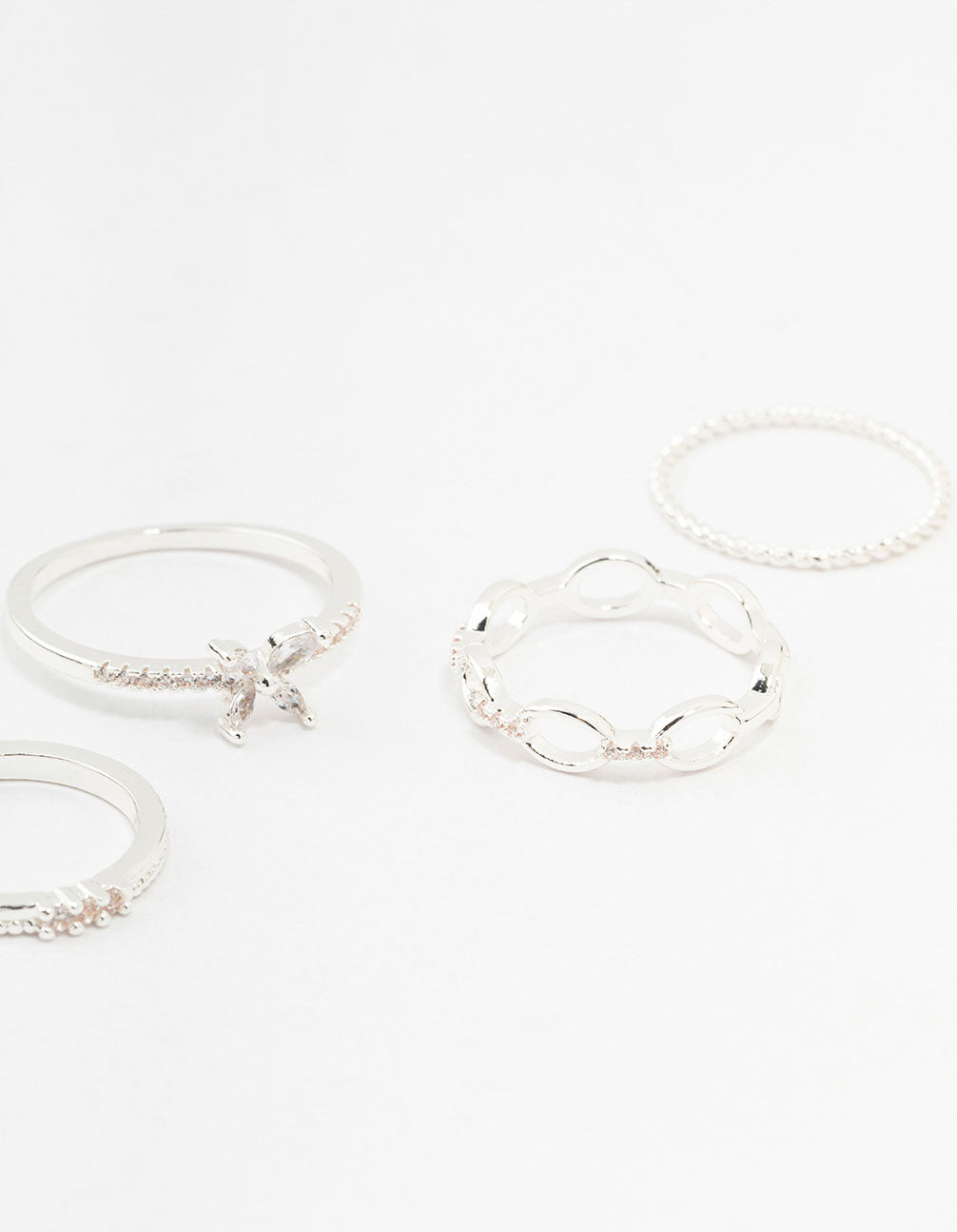 Ring in some fun with this stunning 5-pack of silver rings! Featuring butterfly motifs, bow motifs, rope designs, chain designs, and a sparkling cubic zirconia encrusted option, you'll have endless options to upgrade any look instantly.