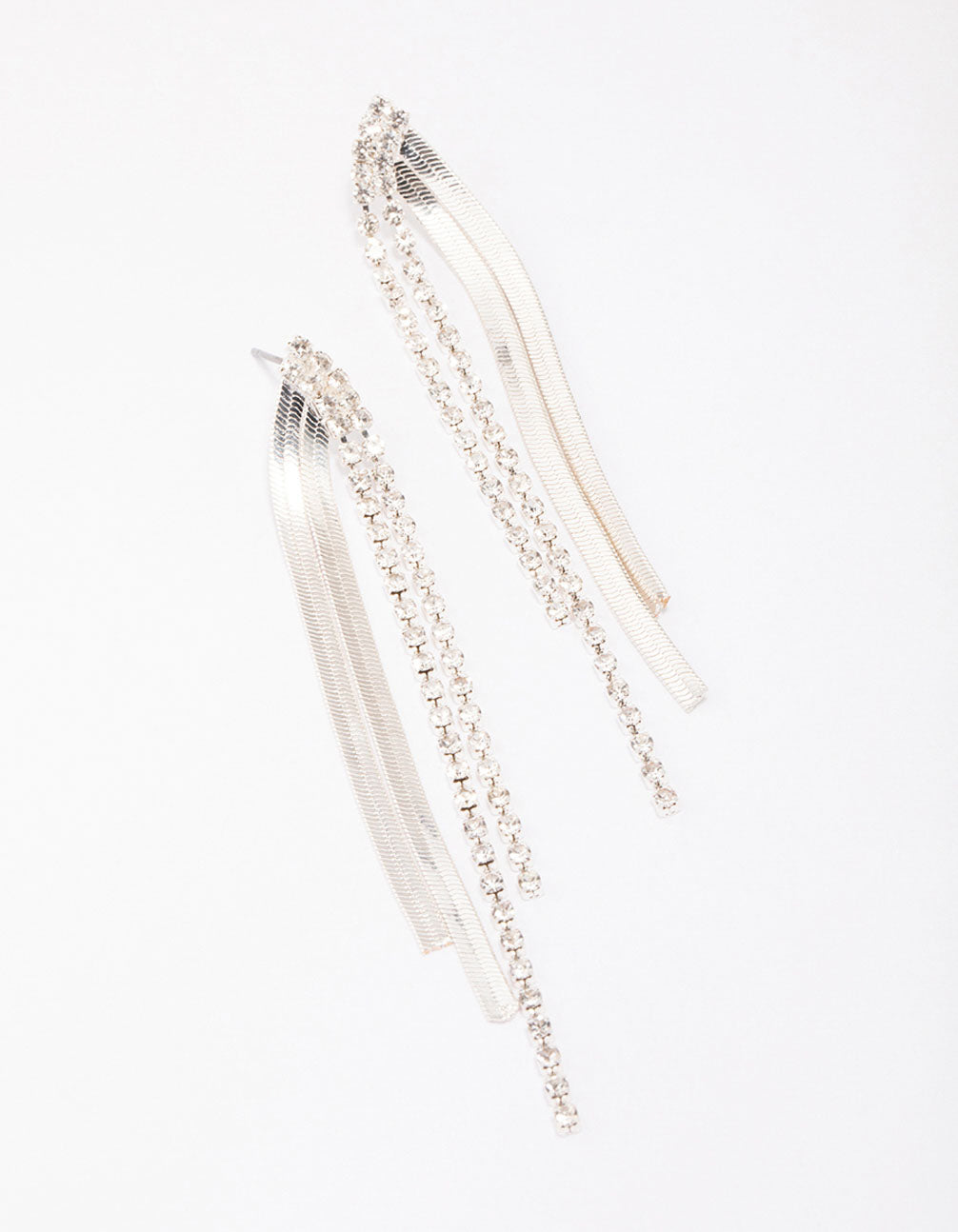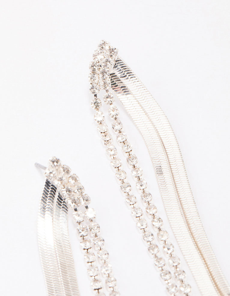 For a modern addition to your stack, style these silver-toned drop earrings. These stunning statement earrings feature a collection of diamante and snake chain strands that form a waterfall-inspired look.