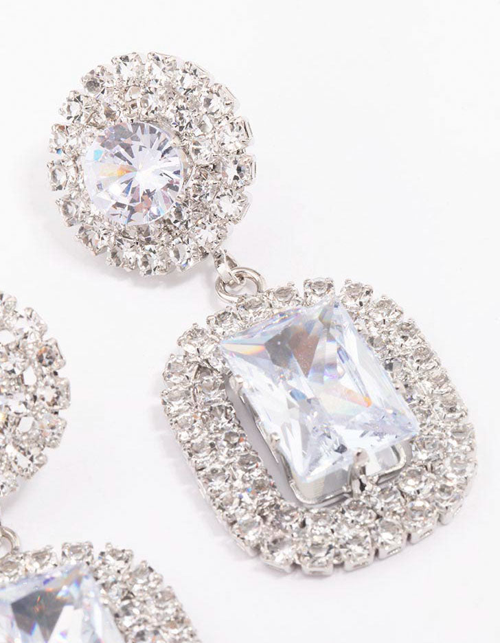 Channel Old-Hollywood glamour with these stunning silver-toned drop earrings. These unique statement earrings feature a duo of square-cut crystals, encased in a halo of mini diamantes for an eye-catching finish.