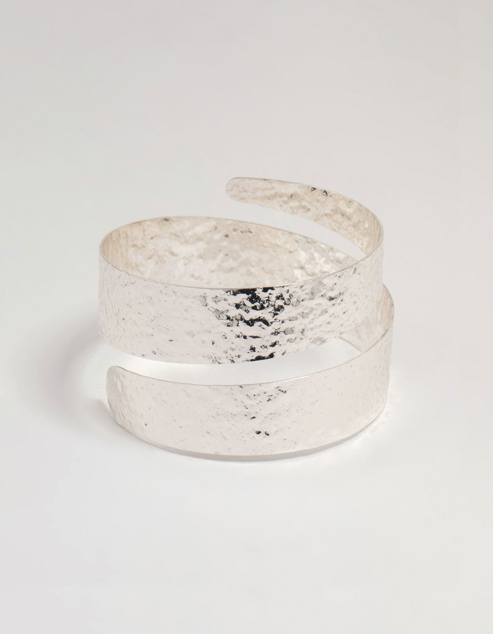 Add a touch of effortless elegance to your look with this Silver Molten Spiral Wrist Cuff. Crafted with a sleek silver-toned finish and a unique spiral design, this cuff is the perfect statement piece.