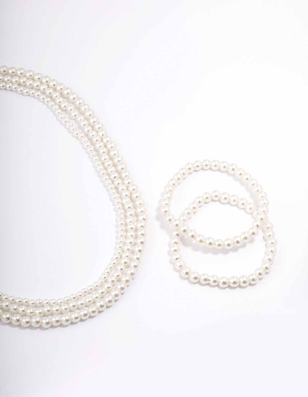 Pearls are back and bigger than ever! Style the pearl trend with this matching jewellery set, featuring a layered necklace and two stretch bracelets. Perfect for pairing with any evening look.