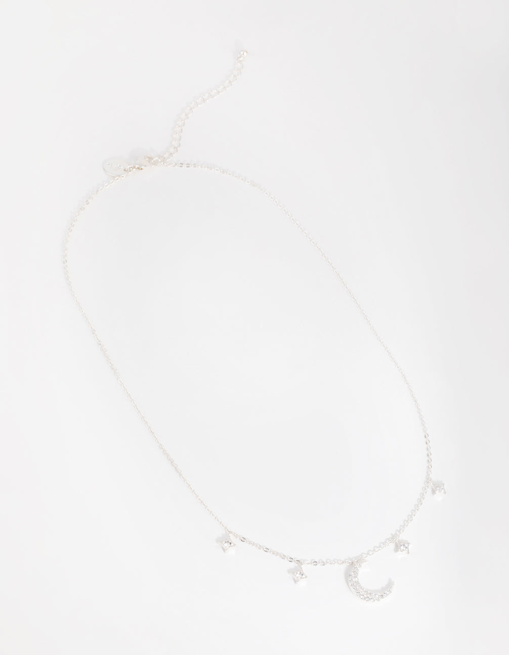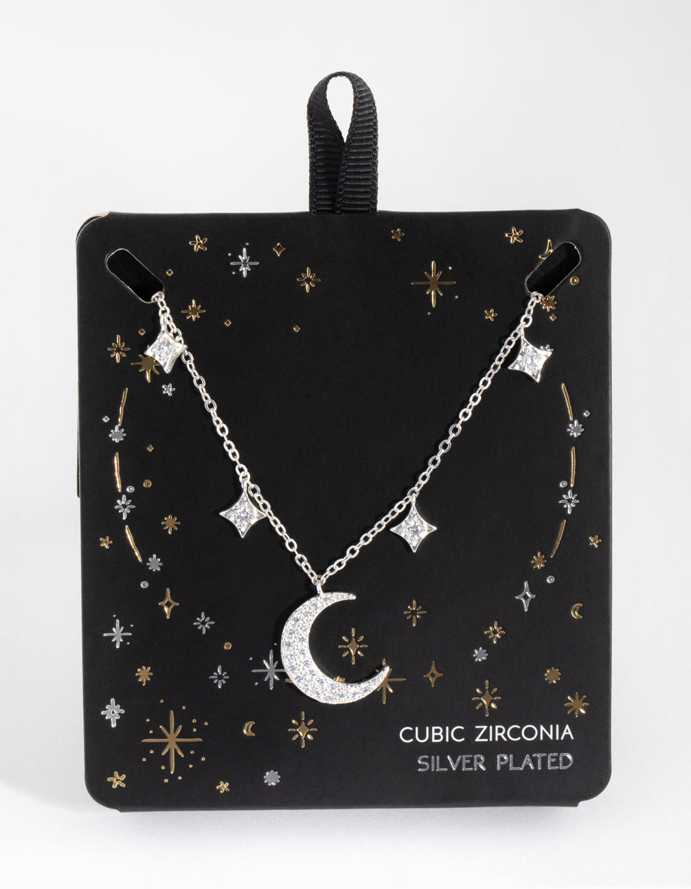 Celestial, talisman and tarot-inspired pieces: a collection of vintage-inspired jewellery designed to be kept and treasured. This lovely necklace is plated with genuine silver for authentic lustre and shine. It features a crescent-moon pendant with cubic-zirconia embellishments amongst a row of hanging star charms. Beautiful and dainty, this ethereal piece evokes an otherworldly charm.