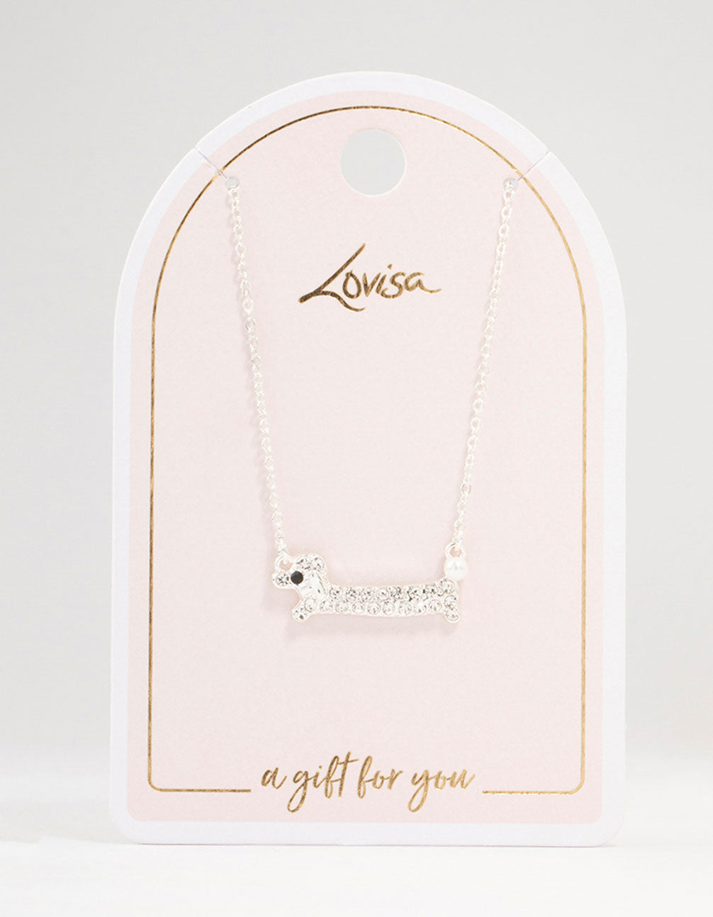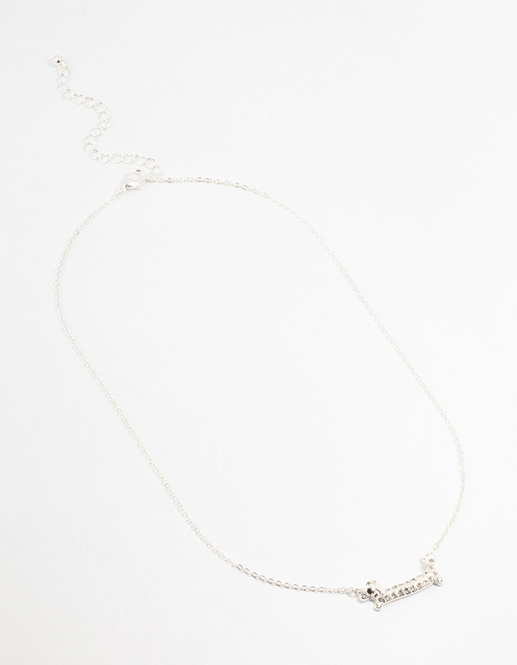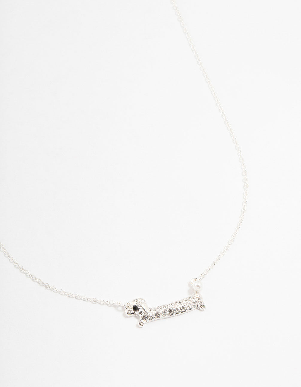 Unleash your inner dog lover with this captivating silver sausage dog necklace adorned with shimmering diamantes. This versatile gifting essential adds a touch of playful charm to any outfit, perfect for surprising a loved one.