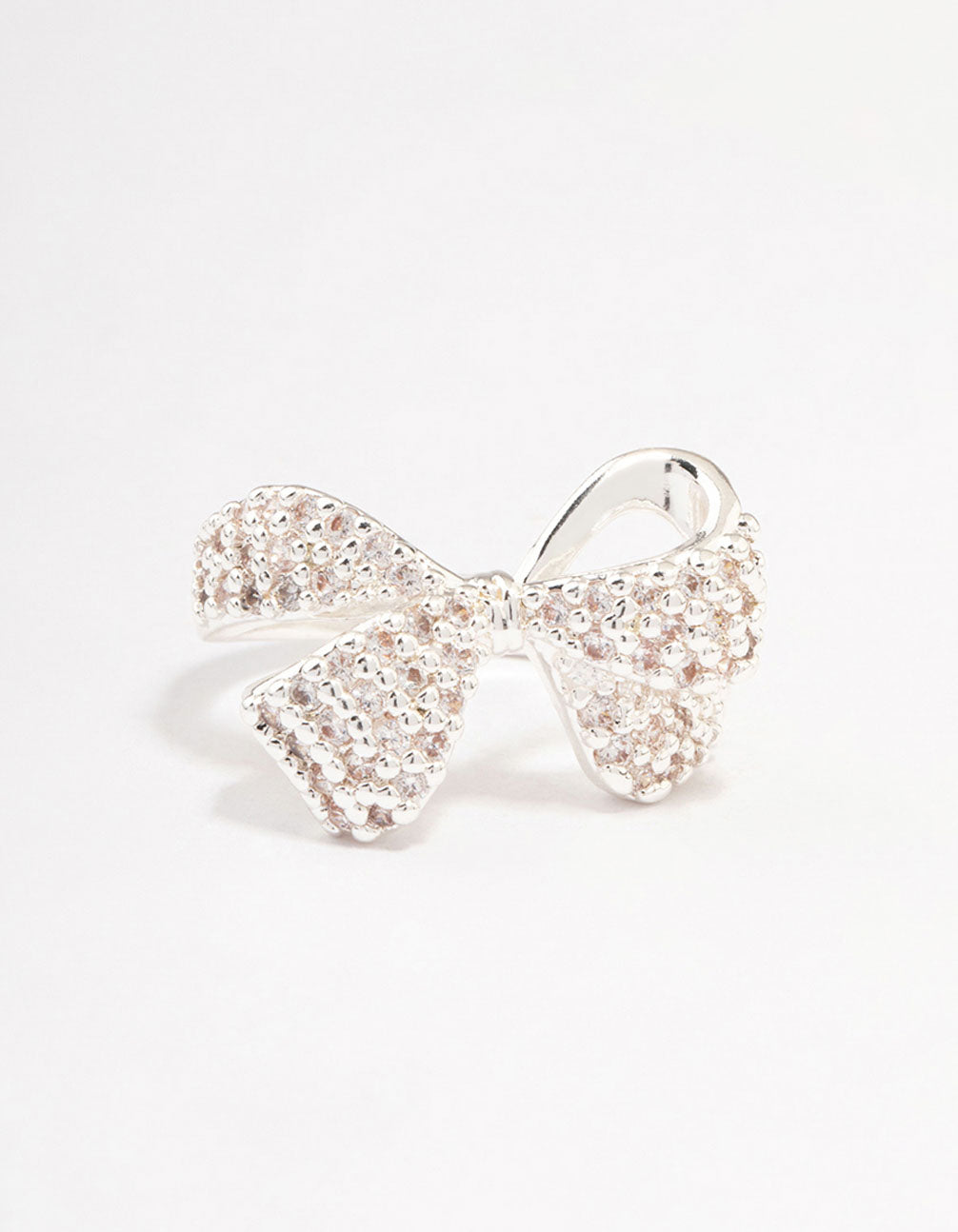 This timeless ring is plated with real silver and features a cubic zirconia encrusted bow motif.