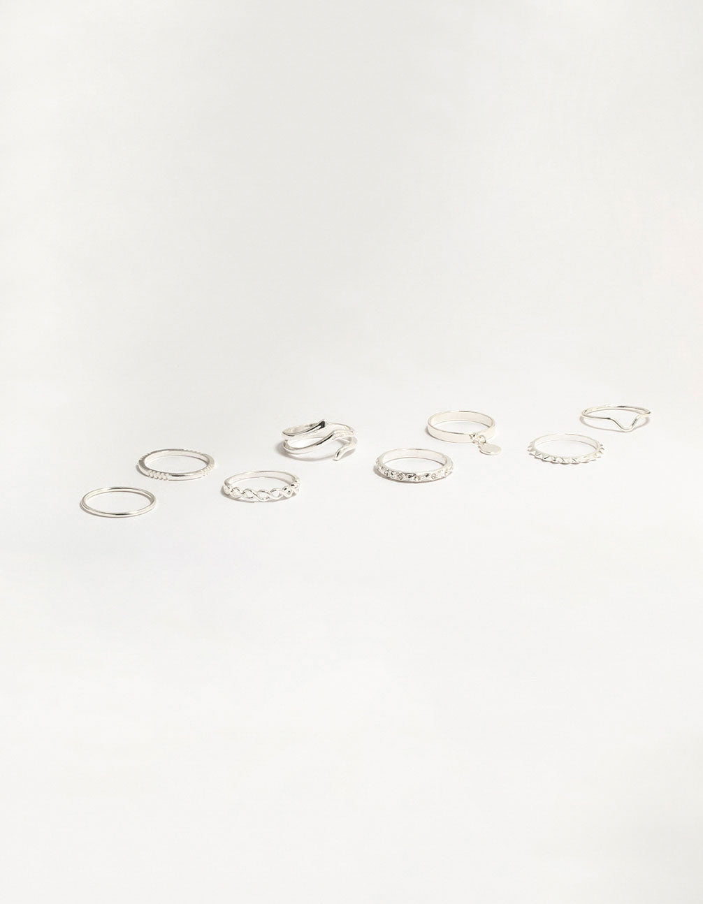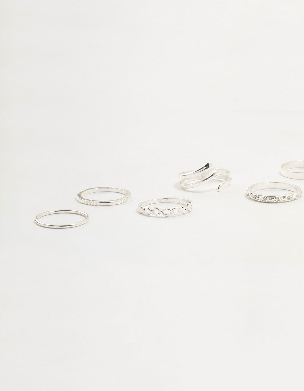 Spice up your style with this set of 8 fabulous stacking rings in trendy silver tones. With wave, twisted, snake, smooth, and diamante designs for a dazzling look that's as unique as you are. Perfect for creating a chic, sophisticated stack.