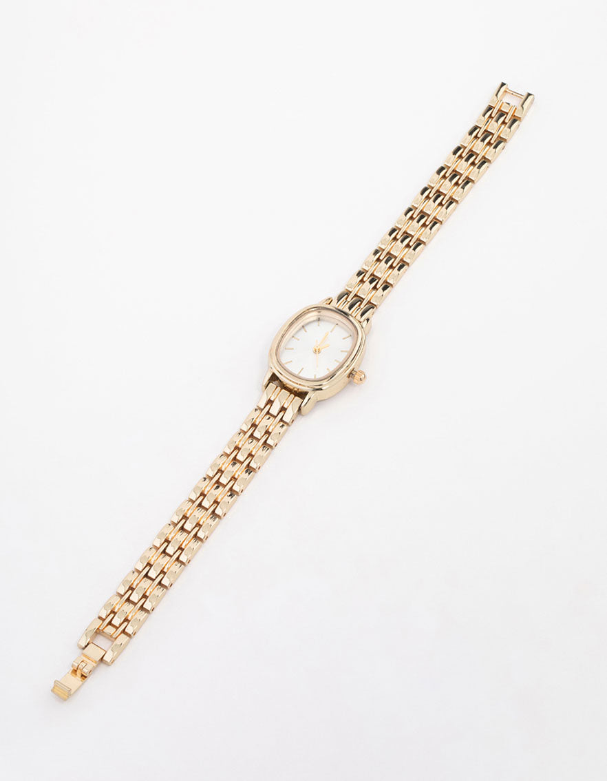 Tell the time in style with this stunning watch. This watch features a cool oval shaped watch face and a sleek gold base, perfect to upgrade your wrist stack and for being stylishly on time.