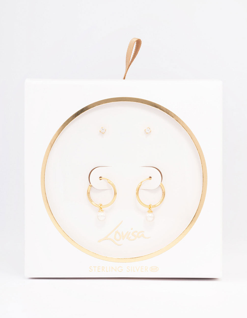 Gold Plated Sterling Silver Cubic Zirconia & Pearl Huggie Earring Pack