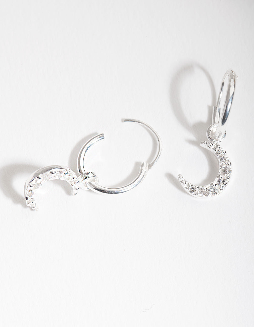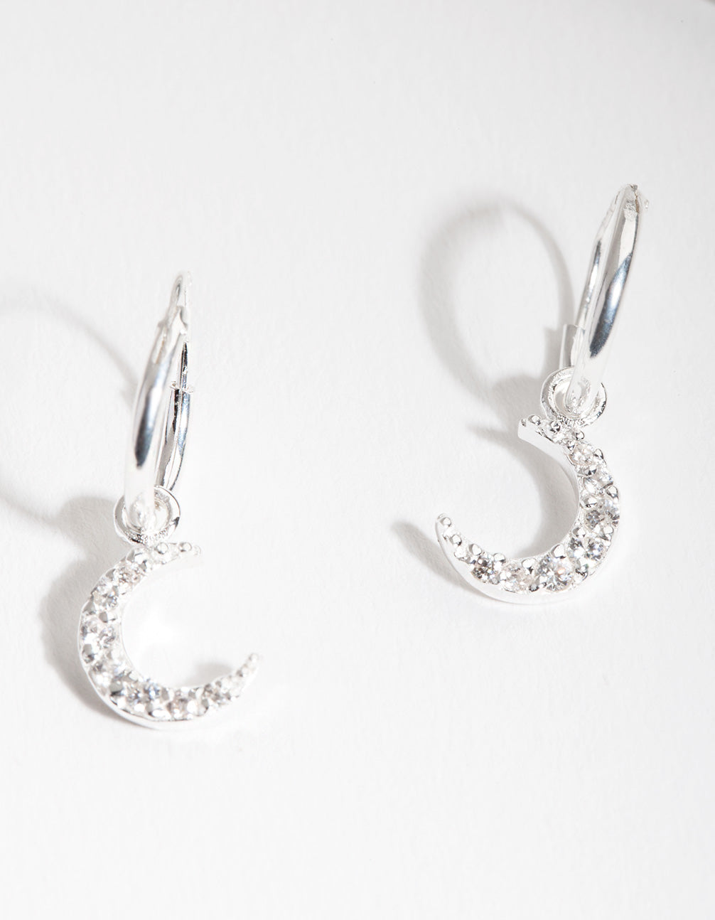 Sterling Silver Diamante Moon Charm Hoop Earrings