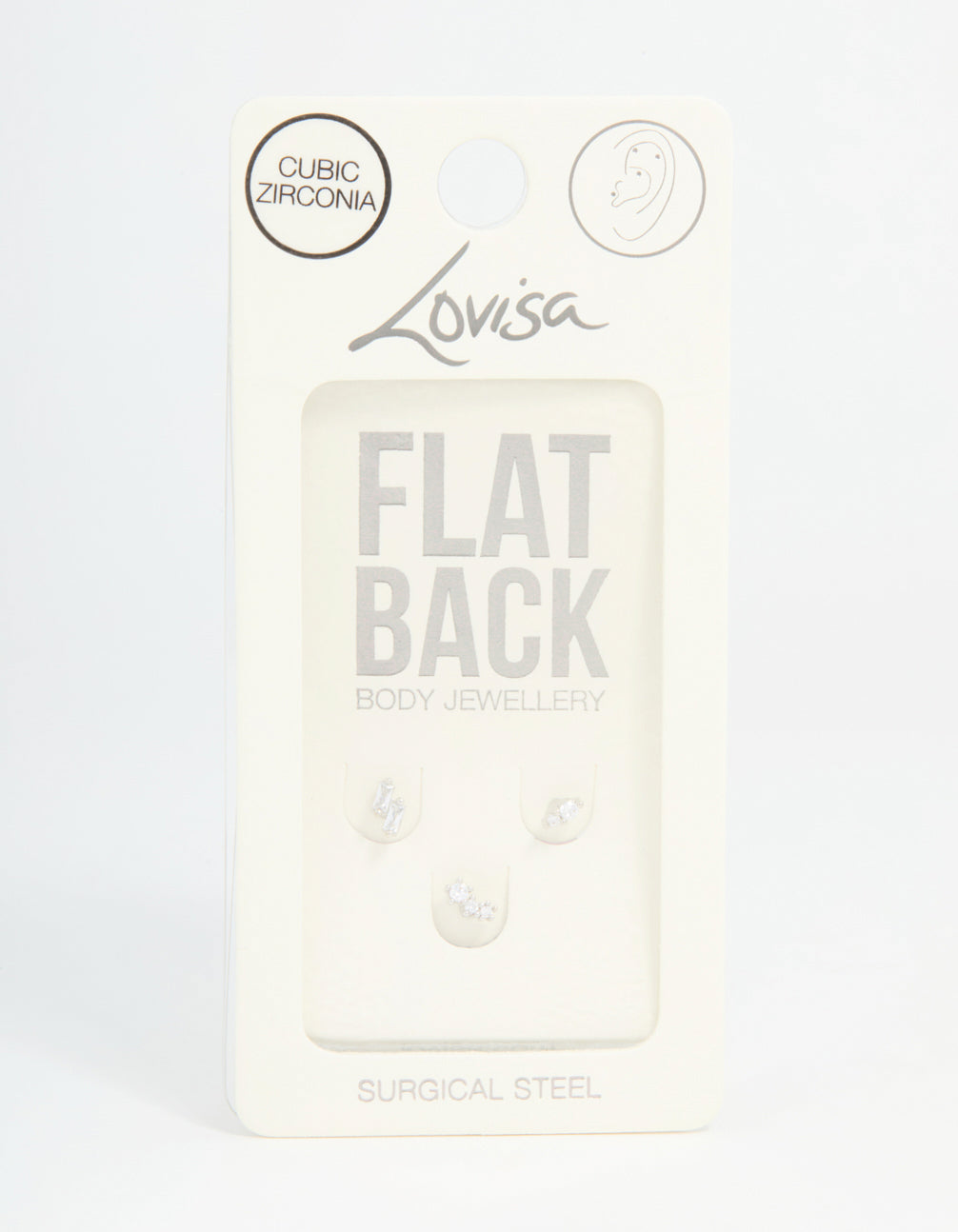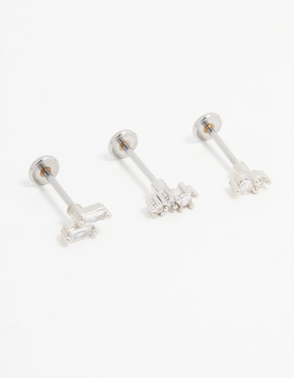 Upgrade your ear game with this surgical steel flat back pack. Crafted from durable surgical steel, this set is gentle on sensitive skin and perfect for everyday wear. Each stud features sleek cubic zirconia crystals for added sparkle.
