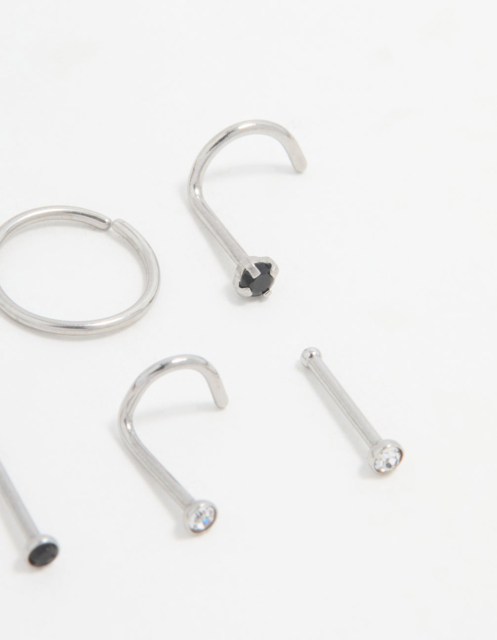 Surgical Steel Black Cubic Zirconia Nose Ring & Stud 6-Pack