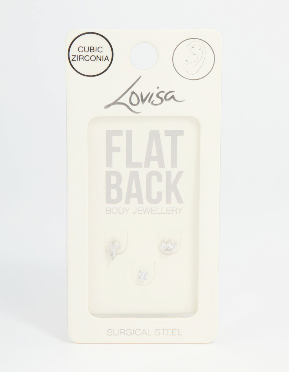 Surgical Steel Fan Double Cubic Zirconia Flat Back Studs 3-Pack