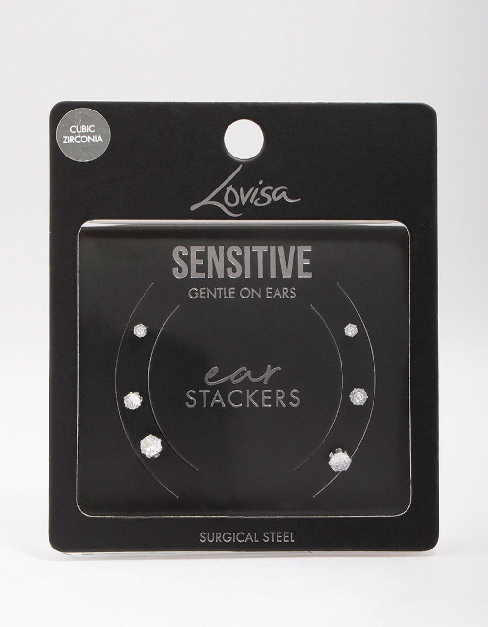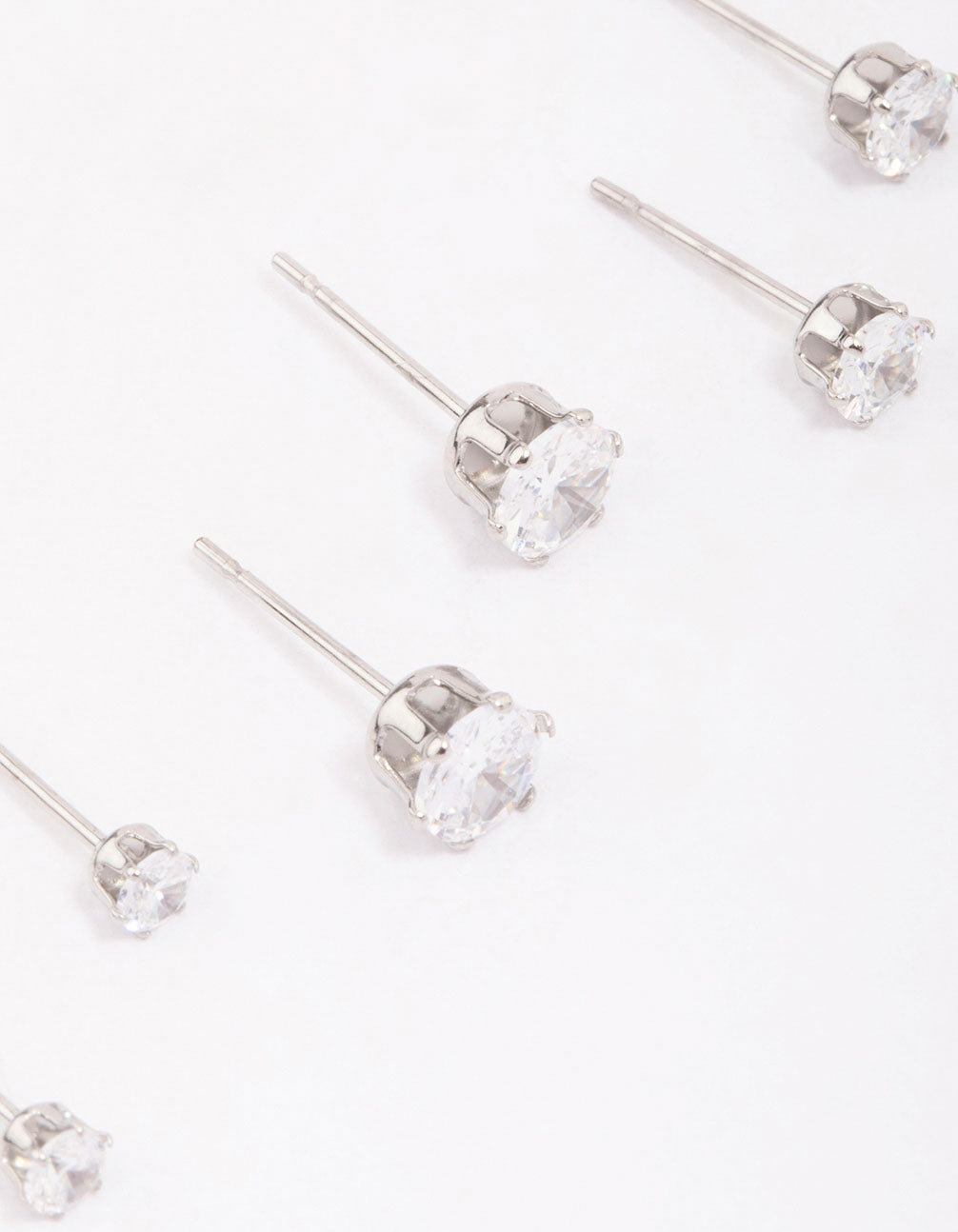 Add a touch of sparkle to your everyday ear stack with this pack of cubic zirconia stud earrings. This earring pack includes three pairs of surgical steel earrings, each designed with varying sizes of crystals. Perfect for adding a luxe touch to your stack.