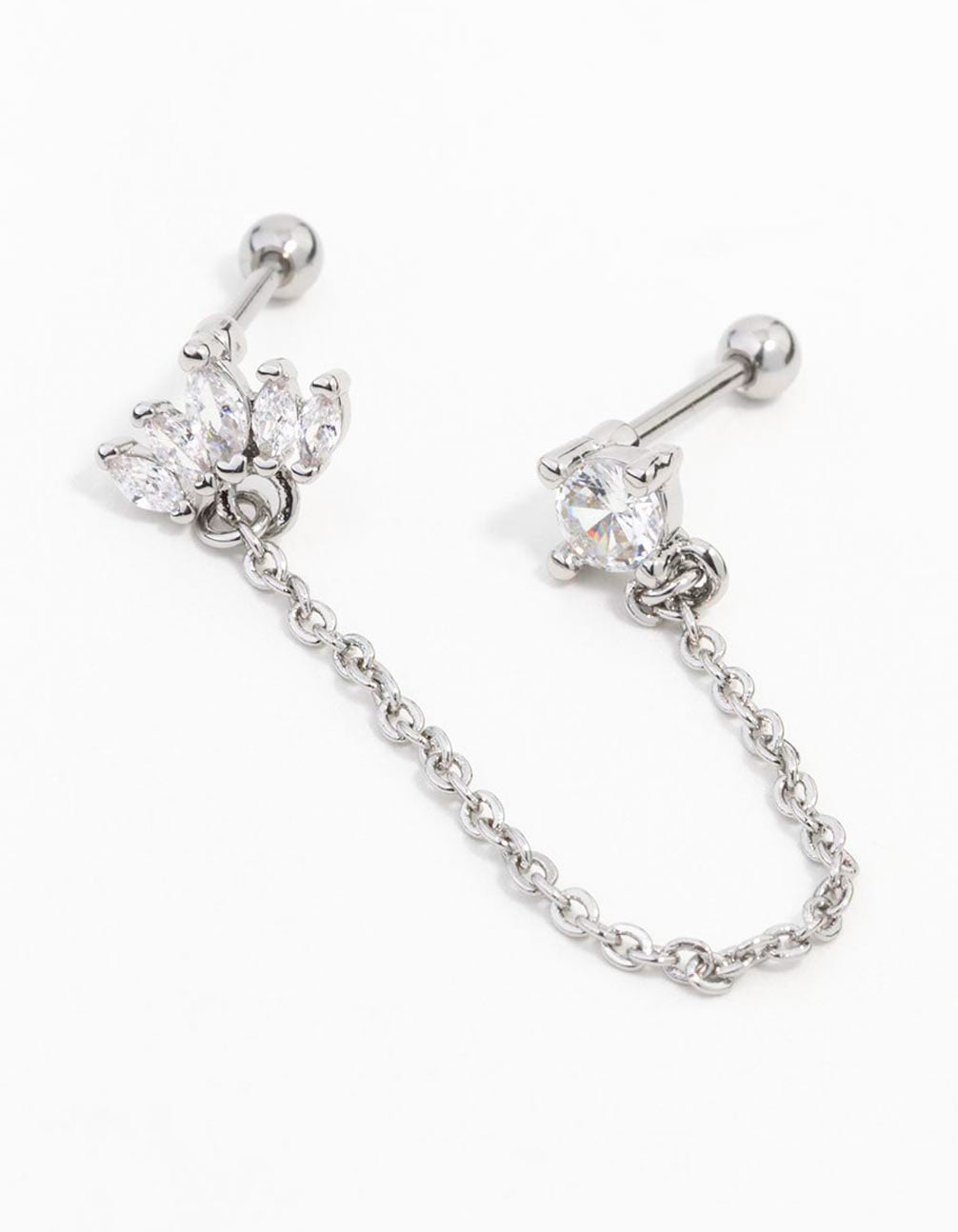 This stylish barbell surgical steel marquise and chain double earrings feature a modern and minimalist design. Made of hypoallergenic surgical steel, these earrings are safe for those with sensitive ears.