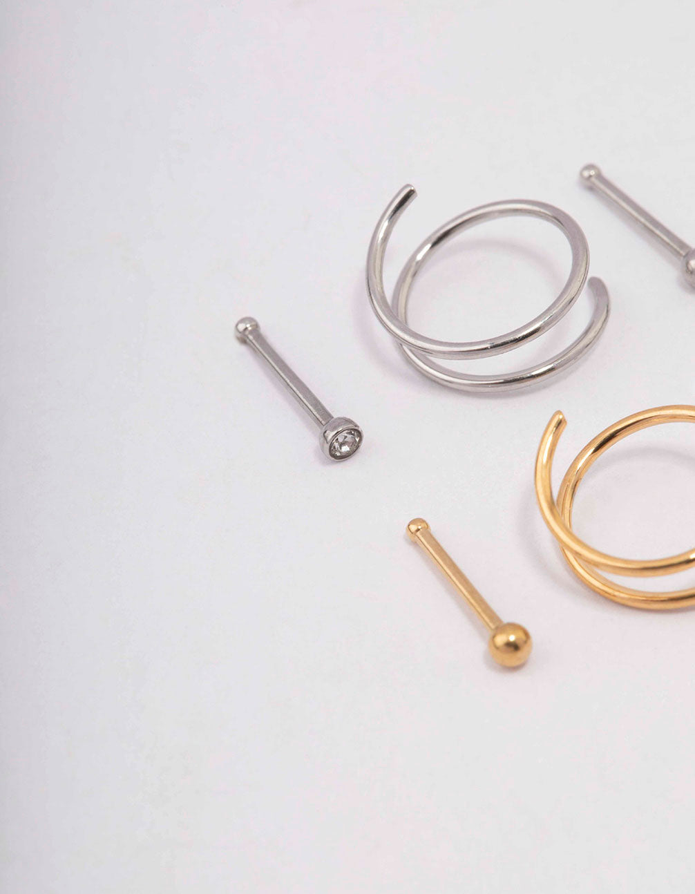 This pack of surgical steel nose piercings contains a mix of surgical steel and gold plated nose piercings in a stud and spiral design.