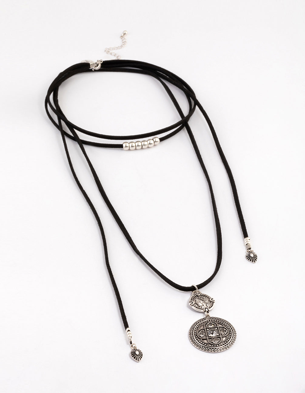 Antique Silver Multi Disc Suede Cord Layered Necklace