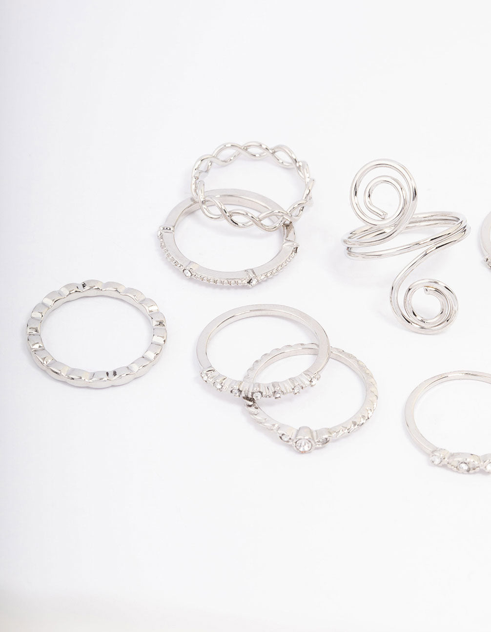 - Embellish your outfit with this pack of unique, silver-toned rings designed with a collection of swirling patterns for added interest.