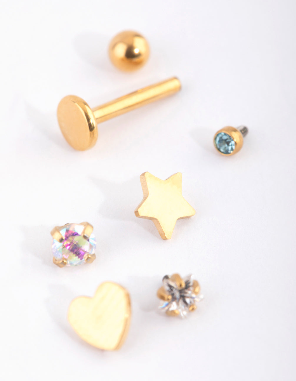 Gold Plated Titanium Single Flat Back Bar & Mixed Motif Interchangeable Ends 6-Pack