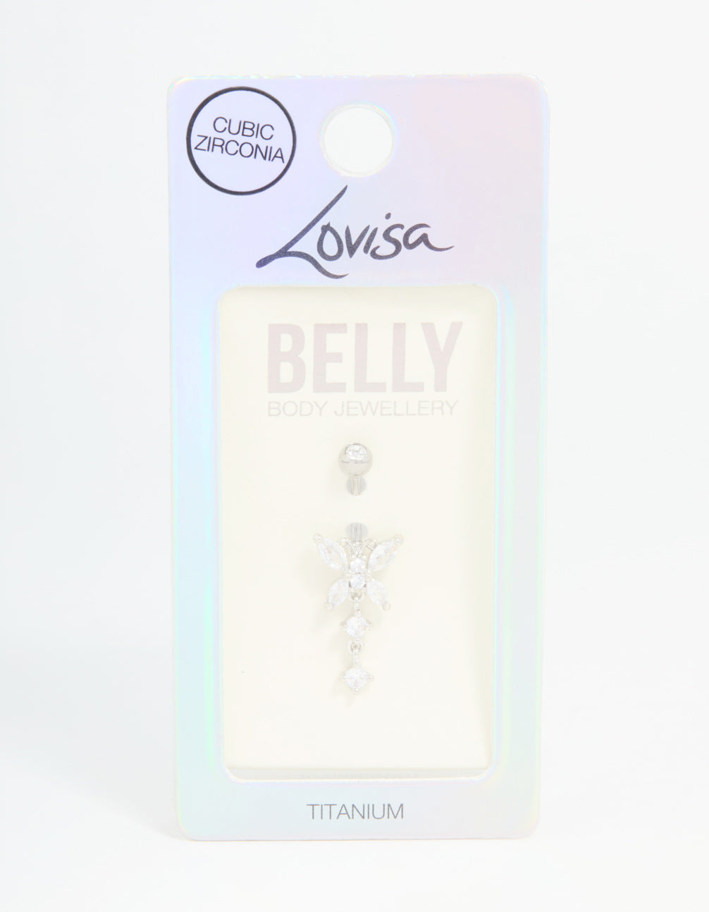 Add some sparkle to your look with this Titanium Cubic Zirconia Butterfly Drop Belly Bar! This belly bar features a delicate butterfly design adorned with dazzling cubic zirconia crystals. Crafted from titanium for hypoallergenic wear.