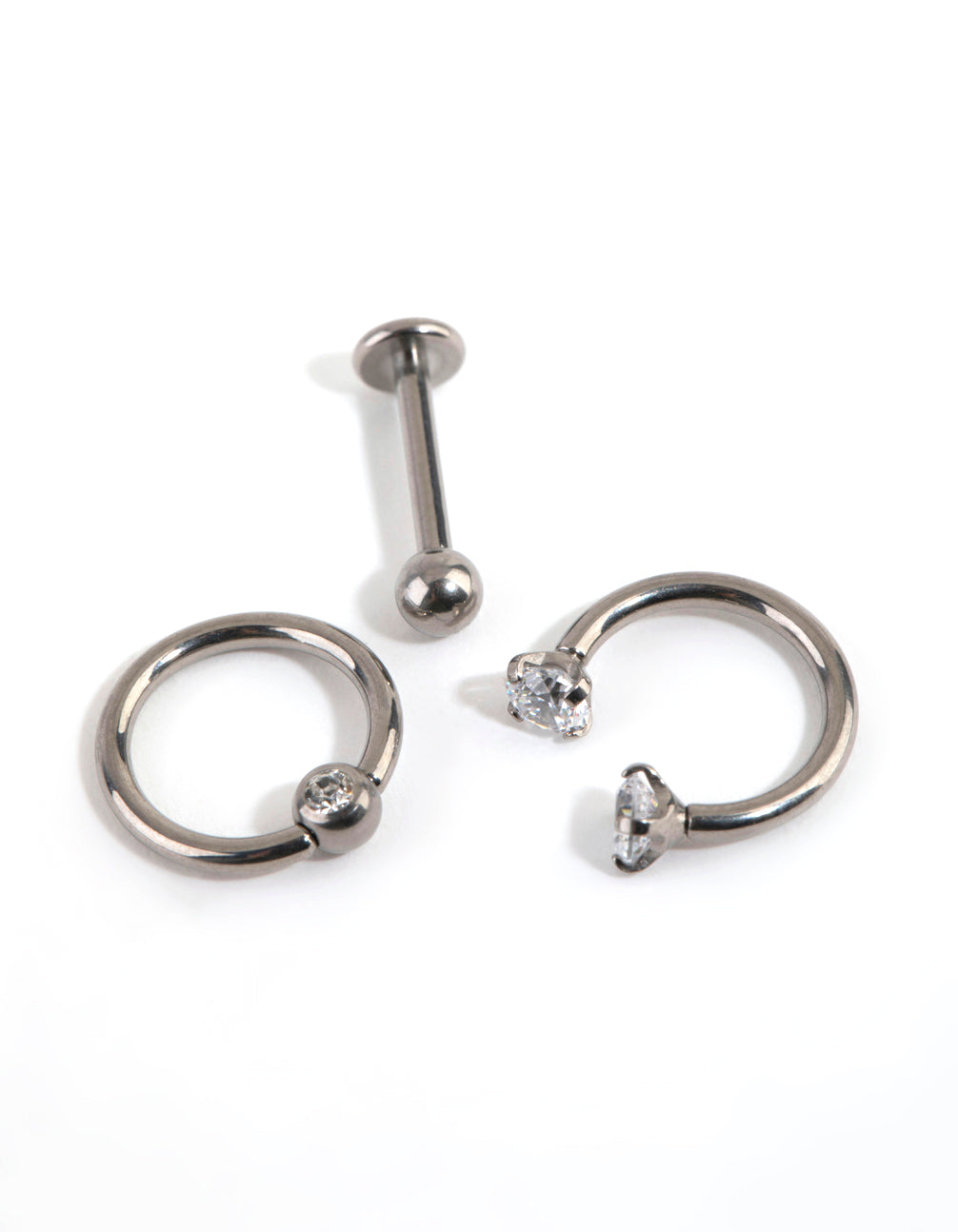 Express your individuality with Lovisa body jewellery! This earring pack is made with titanium, which is gentle on skin. It includes a horse shoe earring, a flat back stud and a clicker ring. Each piece measures 16G/1.2mm.