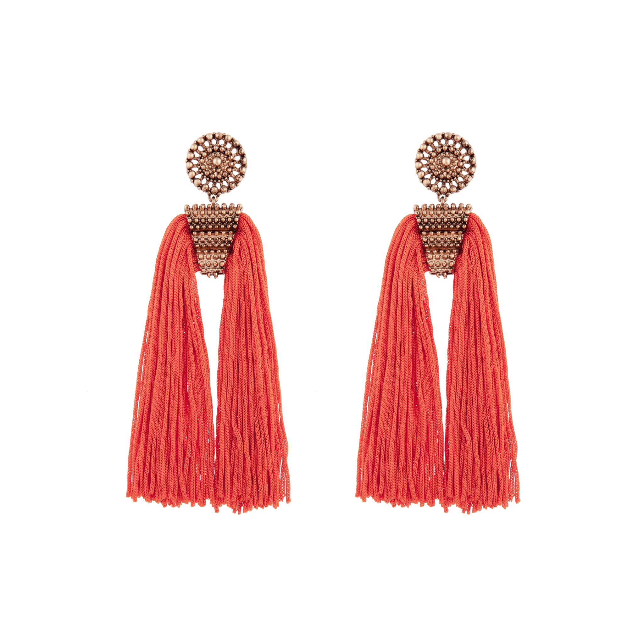 A pair of antique-gold-toned earrings with a split orange tassel.