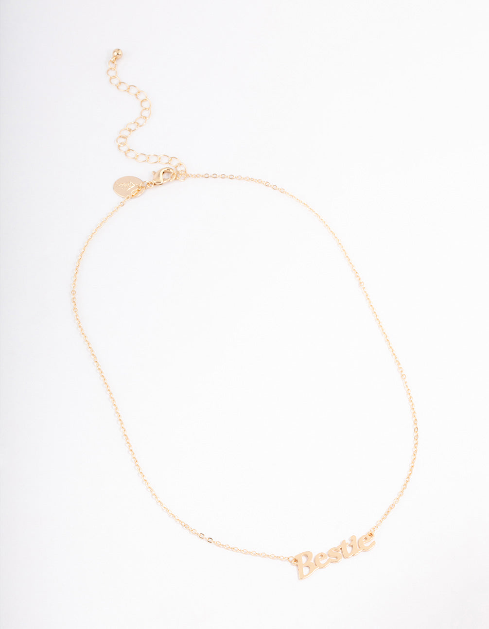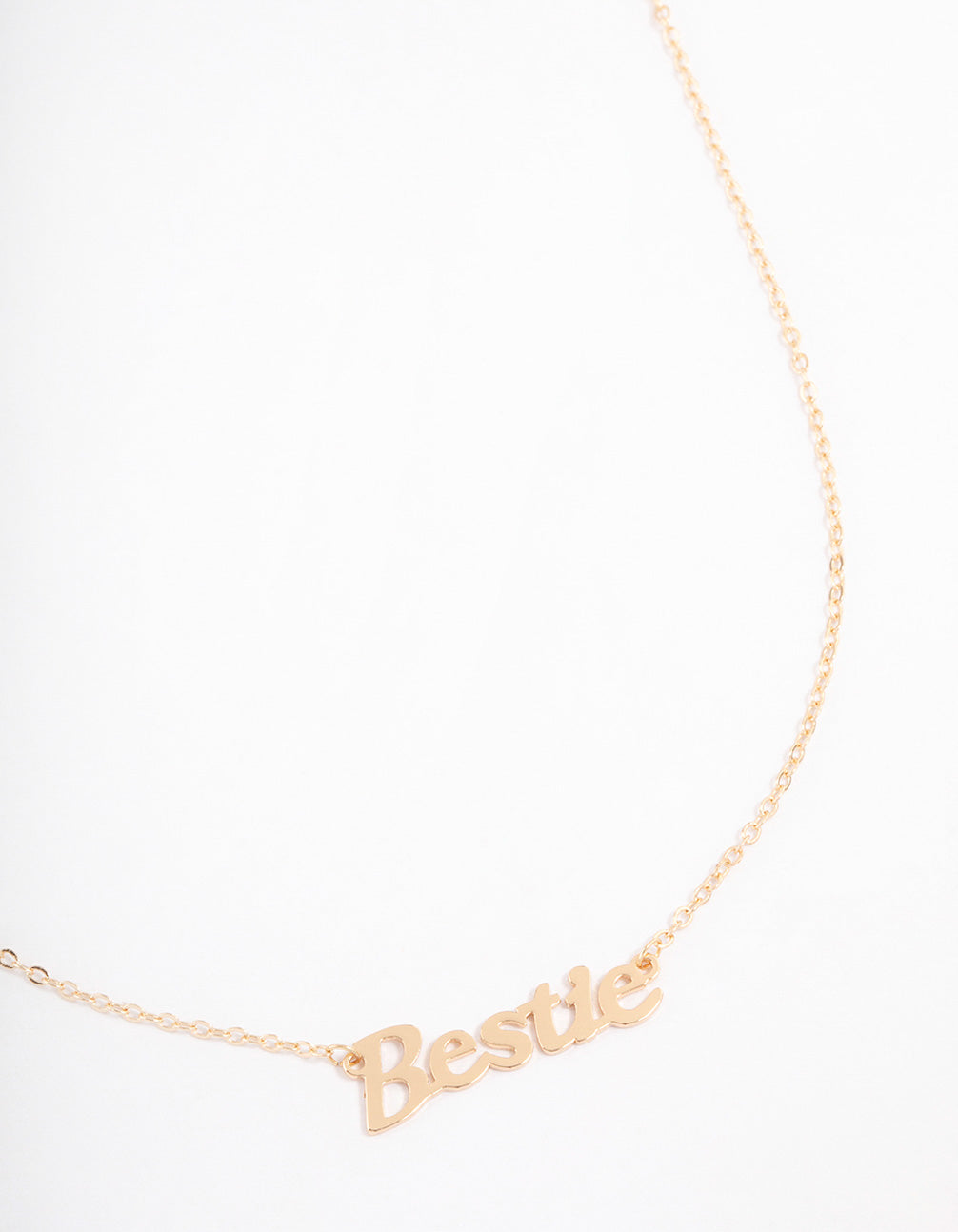 - This necklace features a gorgeous gold setting with a 'Bestie' script pendant, perfect for you and your BFF!
