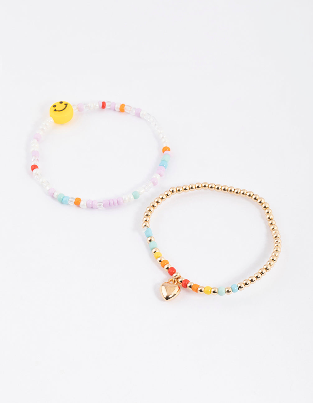 - This bracelet pack includes two individual, beaded bracelets - one rainbow and one gold with a smiley face and heart charm.