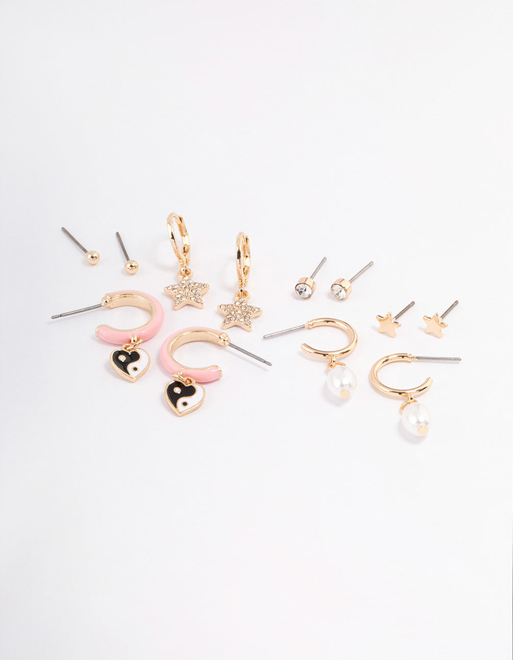 - This earring six-pack includes three, gold-toned huggie hoop earrings and three pairs of studs to match.