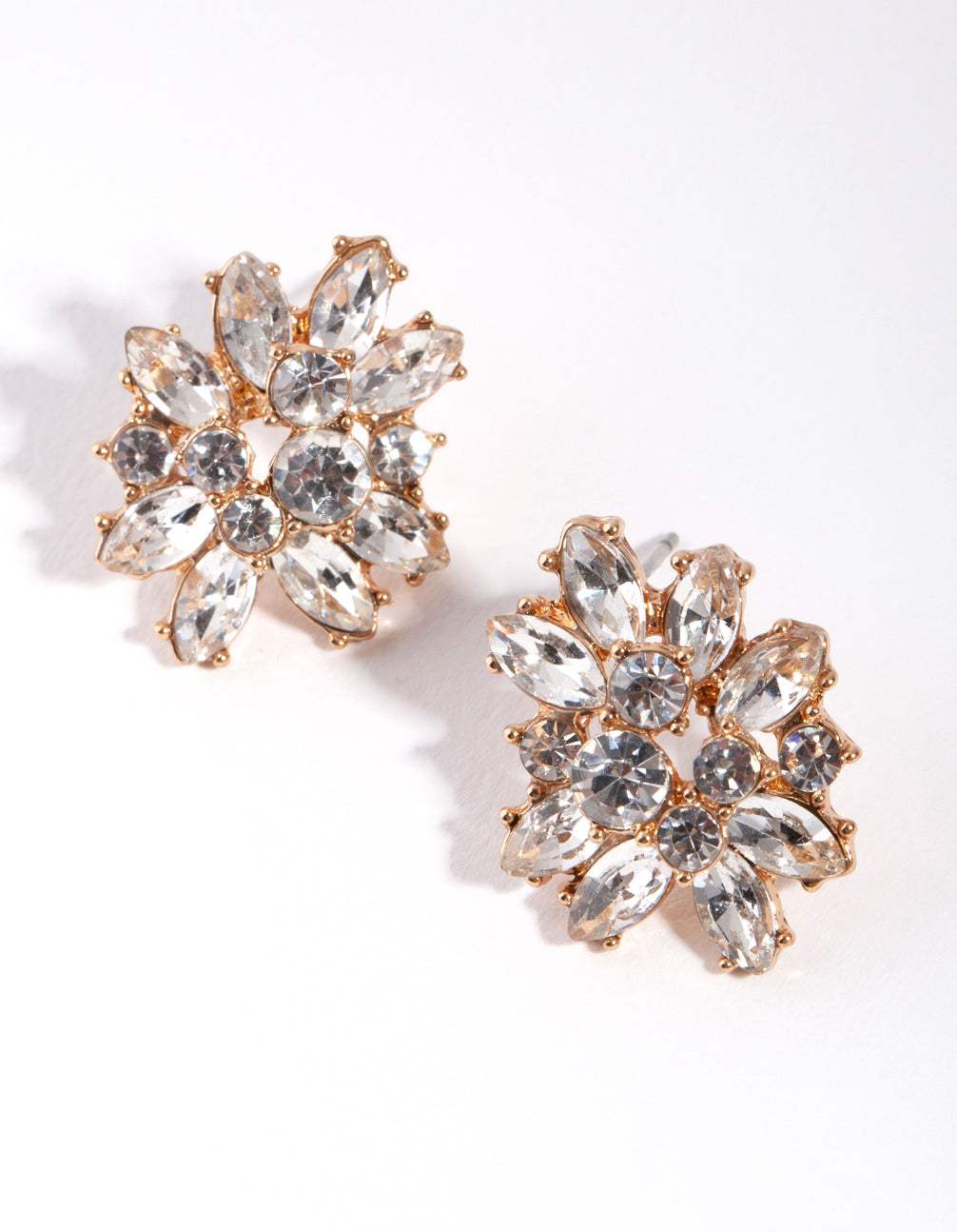 Everyone needs some knockout statement studs! These gorgoeus gold-toned stud earrings are sure to get you noticed. They feature an intricate design encrusted with diamantes for maximum bling and sparkle. Treat yourself!