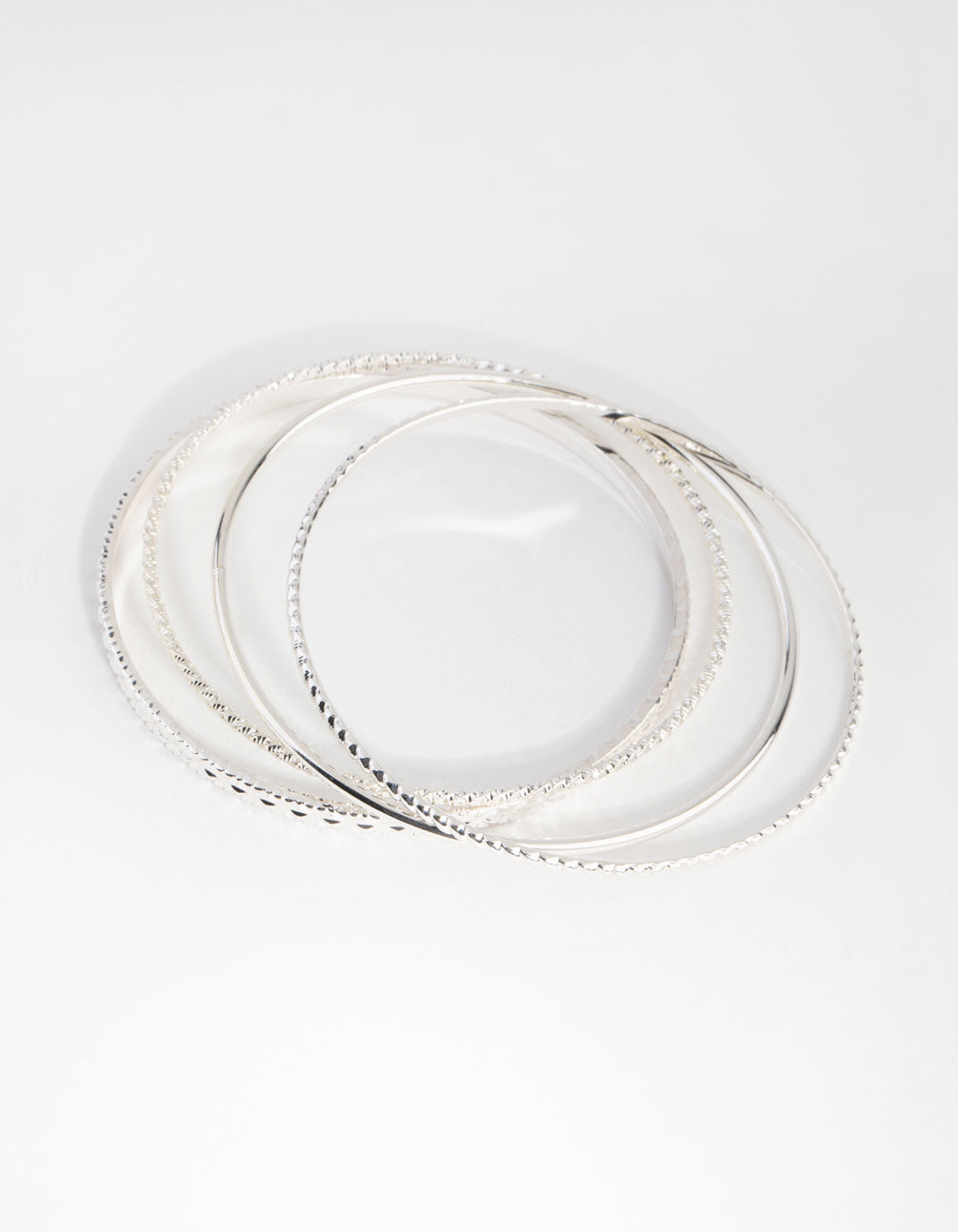 Mix them, match them, stack them! Bangles are a great way to add a playful finishing touch to your look. This set is silver toned, and features four bangles with different textures to inspire intrigue. Stack them with other packs for maximum impact!