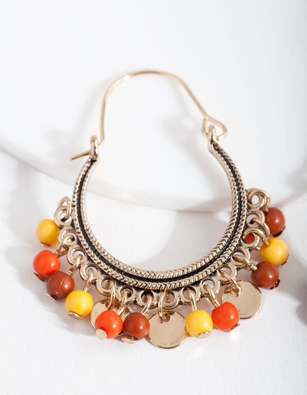 A pair of antique-gold-toned earrings with a neutral bohemian beaded design.