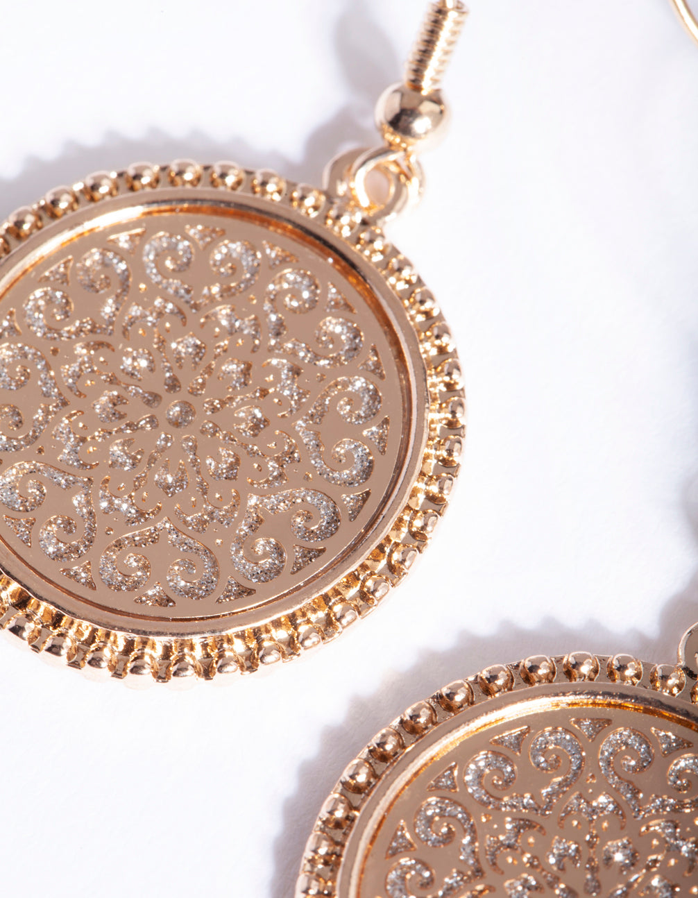 These fun fashion earrings will have you turning heads! This earring boasts a filigree circle disc design with a textured backing in a gold-tone setting
