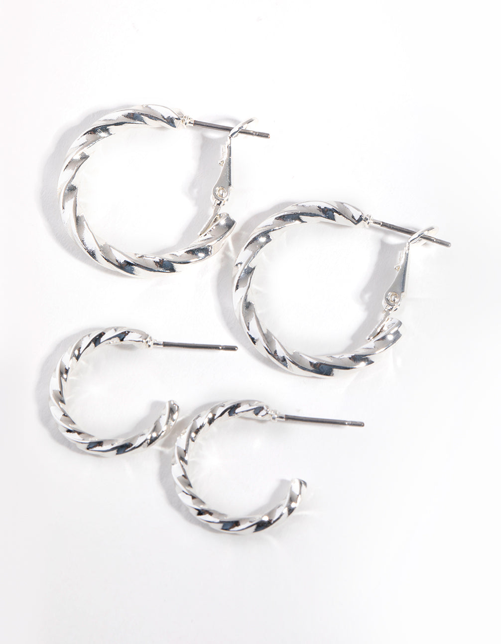 Any ensemble can be elevated with a pair of hoop earrings! This pack includes two pairs of silver-toned hoops with a twisted design. They're in different sizes, so they're perfect for stacking!