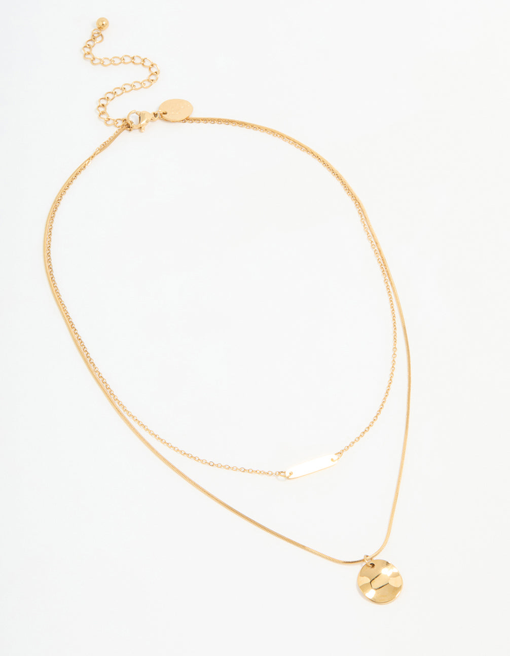 Say hello to your new favourite piece, this Waterproof Gold Plated Stainless Steel Bar & Coin Pendant Necklace! This layered necklace features a sleek bar pendant layer with a chic coin charm layer and blends modern vibes with timeless style.