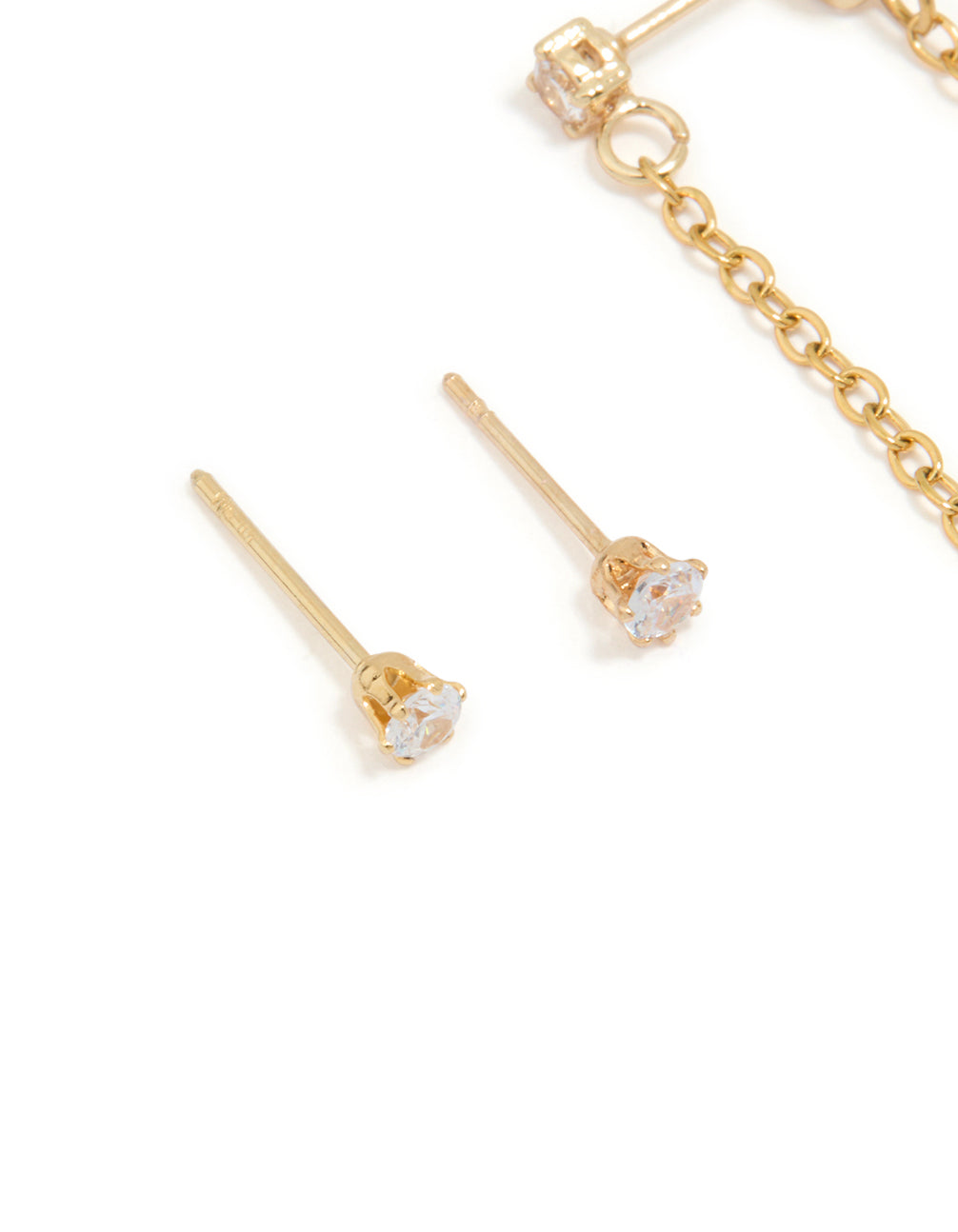 Waterproof Gold Plated Stainless Steel Cubic Zirconia Studs & Dainty Chain Earrings 2-Pack