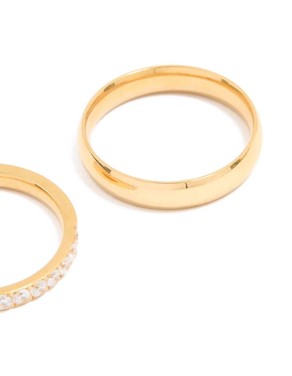 Waterproof Gold Plated Stainless Steel Diamante & Smooth Rings 2- Pack