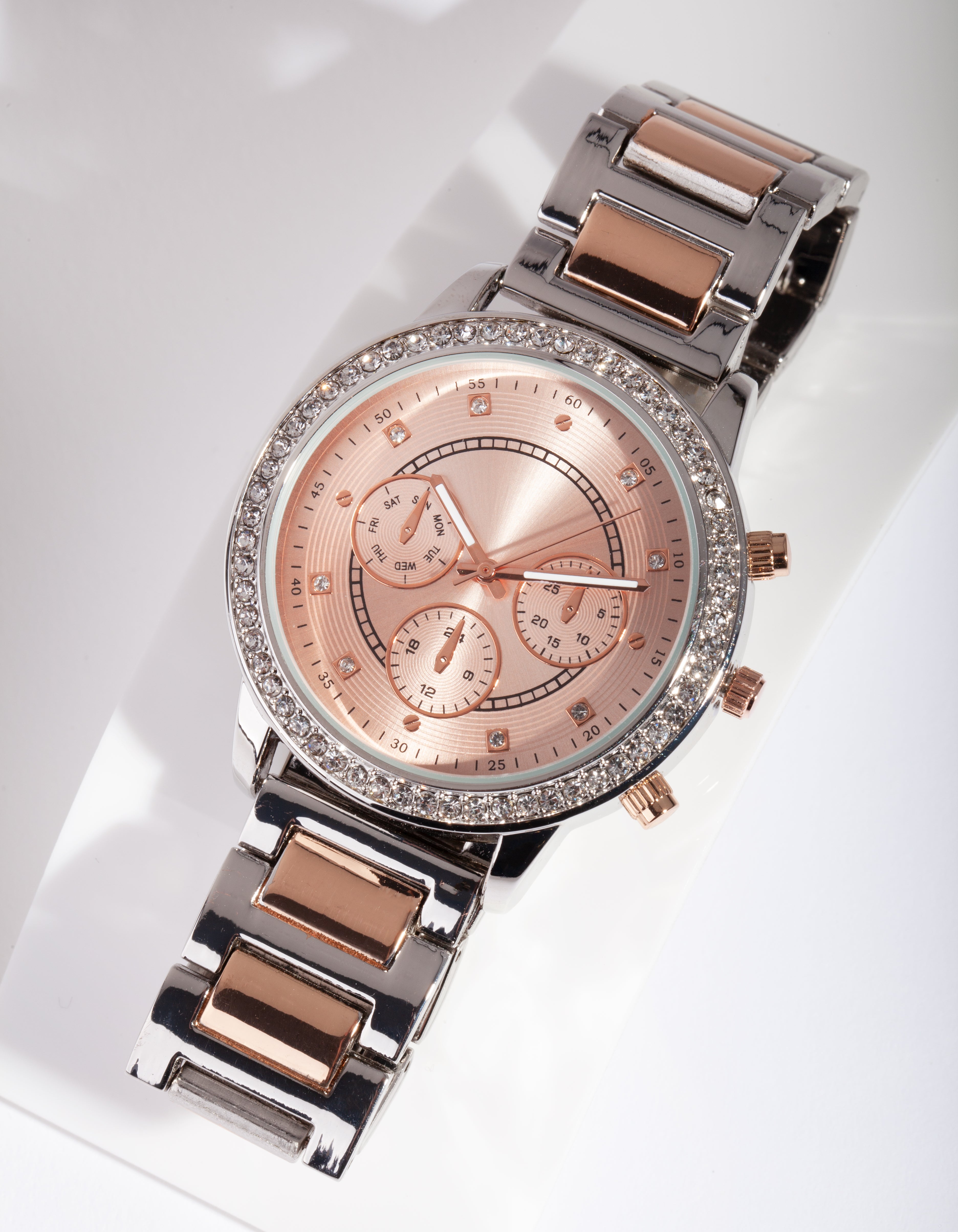 Style this gold and silver, two-toned diamante watch and add a hint of glamour to your outfit.