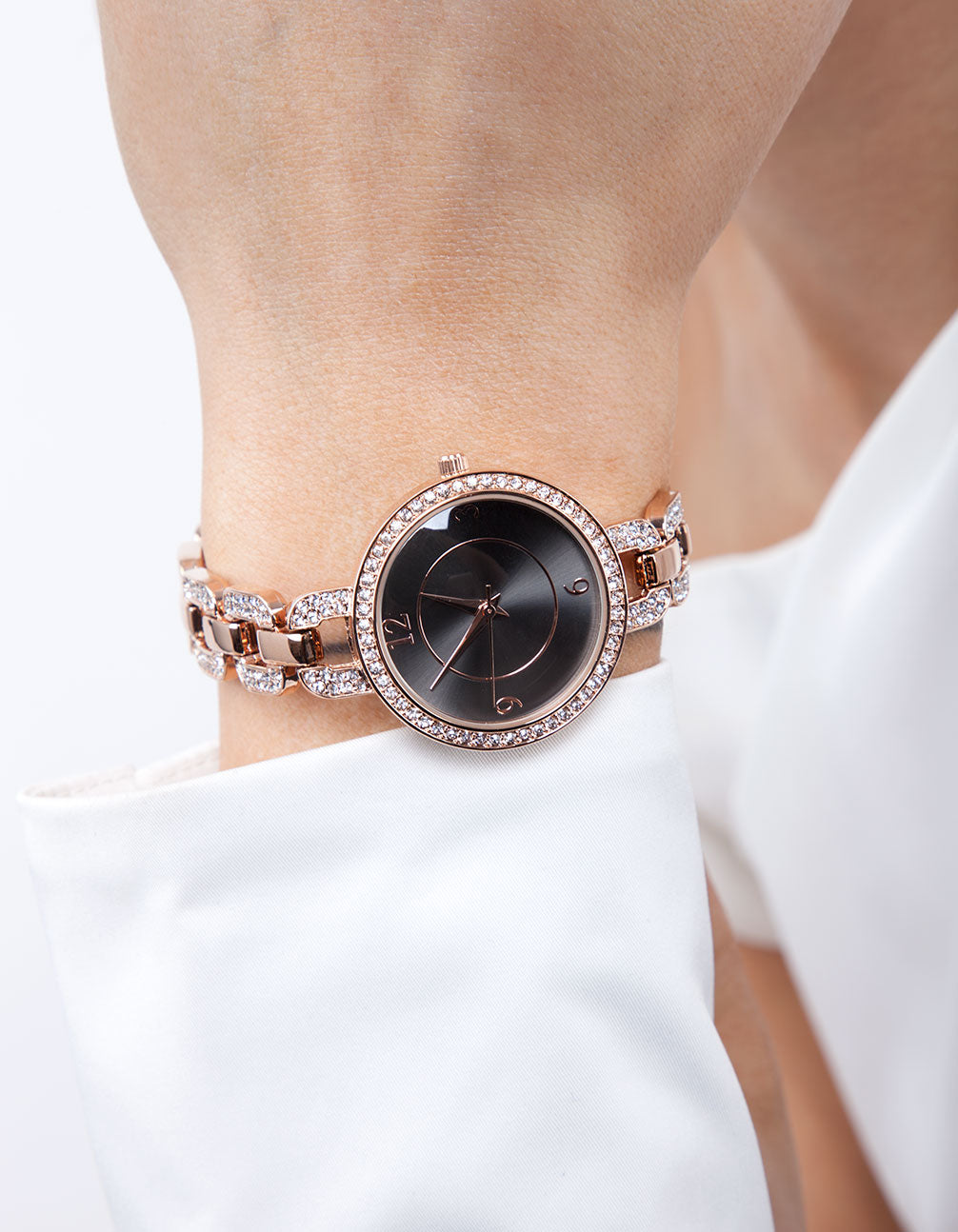 A timepiece is a classic accessory that will stay in style season after season. This watch is both functional and fashionable and features a rose-gold-toned setting with diamante embellishments.