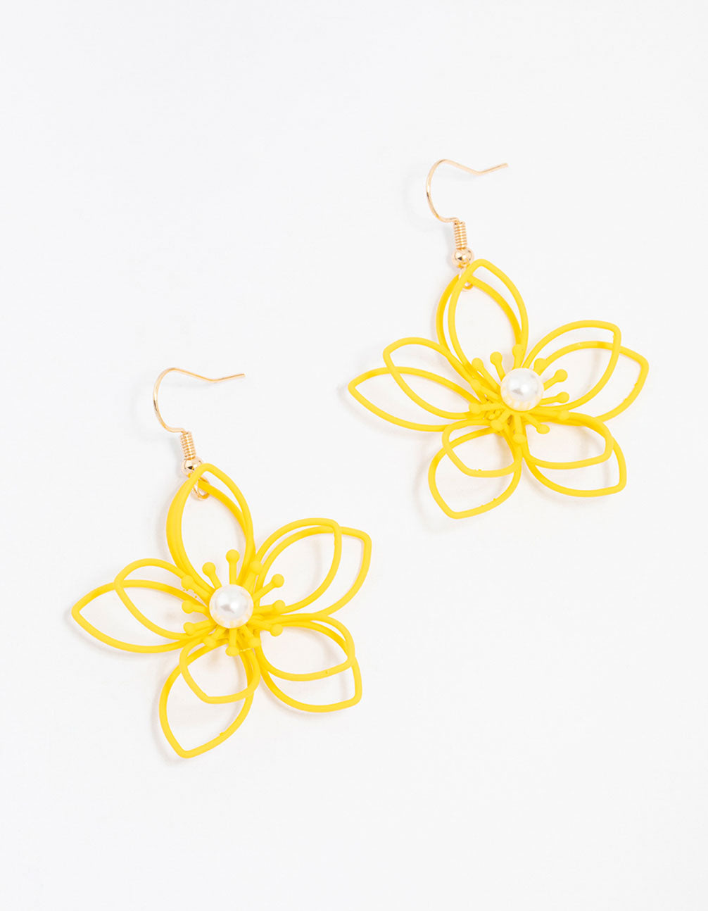 Love an artsy feel to your accessories? These yellow Gold Flower Drop Earrings are your next must-have. These earrings are crafted from delicate sunshine yellow wires forming a creative floral pattern and feature a pearl accent for glamour.