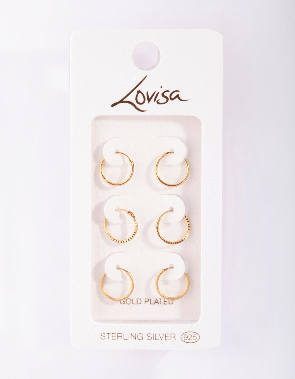 Invest in some outfit staples! This set includes three pairs of small hoop earrings, which are made from sterling silver and are plated with genuine gold. They're gentle on ears, and are perfect for daily wear, or they would make a great base piece for stacking!